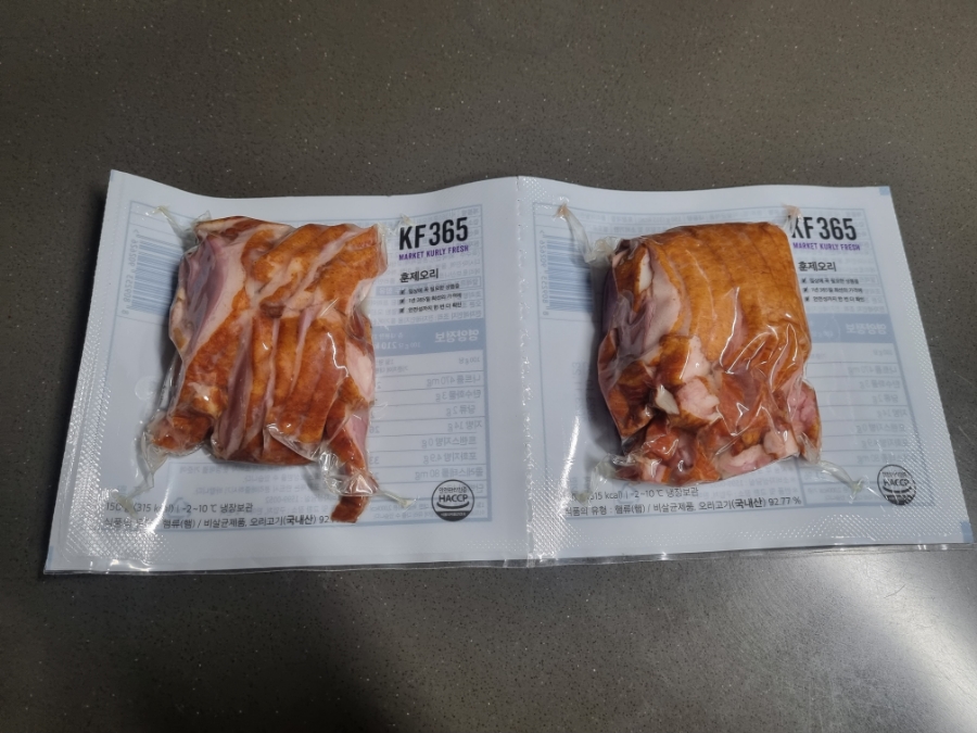 마켓컬리 에서 선택한 150g씩 두팩으로 나뉘어 담겨 있는 KF365 훈제오리. 한 번에 먹기 좋을 양으로 담겨 있어서 한 끼에 한 팩씩 먹기 좋았고, 간편하게 조리하는 밥반찬을 좋아하는 주부의 입장에서 부족함이 없다는 생각이 들었습니다.