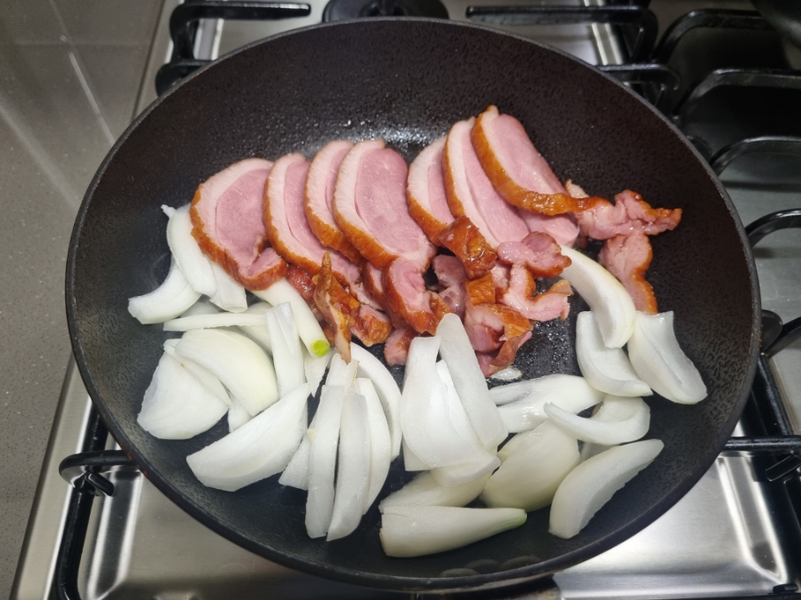 기름을 두르지 않은 예열된 팬에 생각보다 도톰하고 크기가 큰 마켓컬리에서 구매한 훈제오리를 한쪽에 깔아주고, 어린이 주먹만 한 양파를 가늘지 않게 채 썰어서 넣어줍니다.