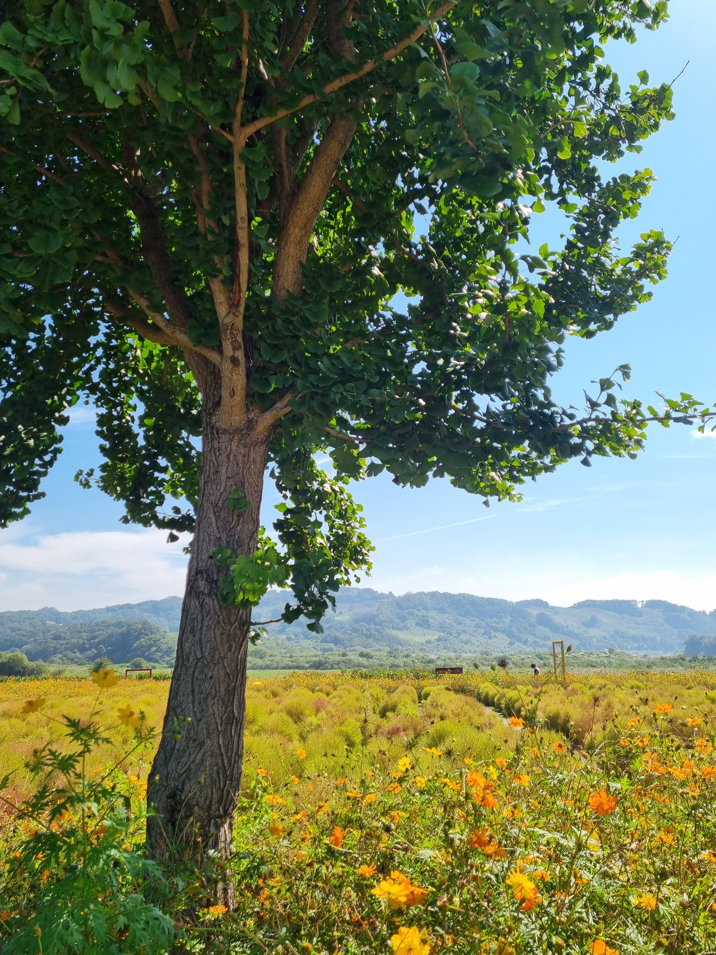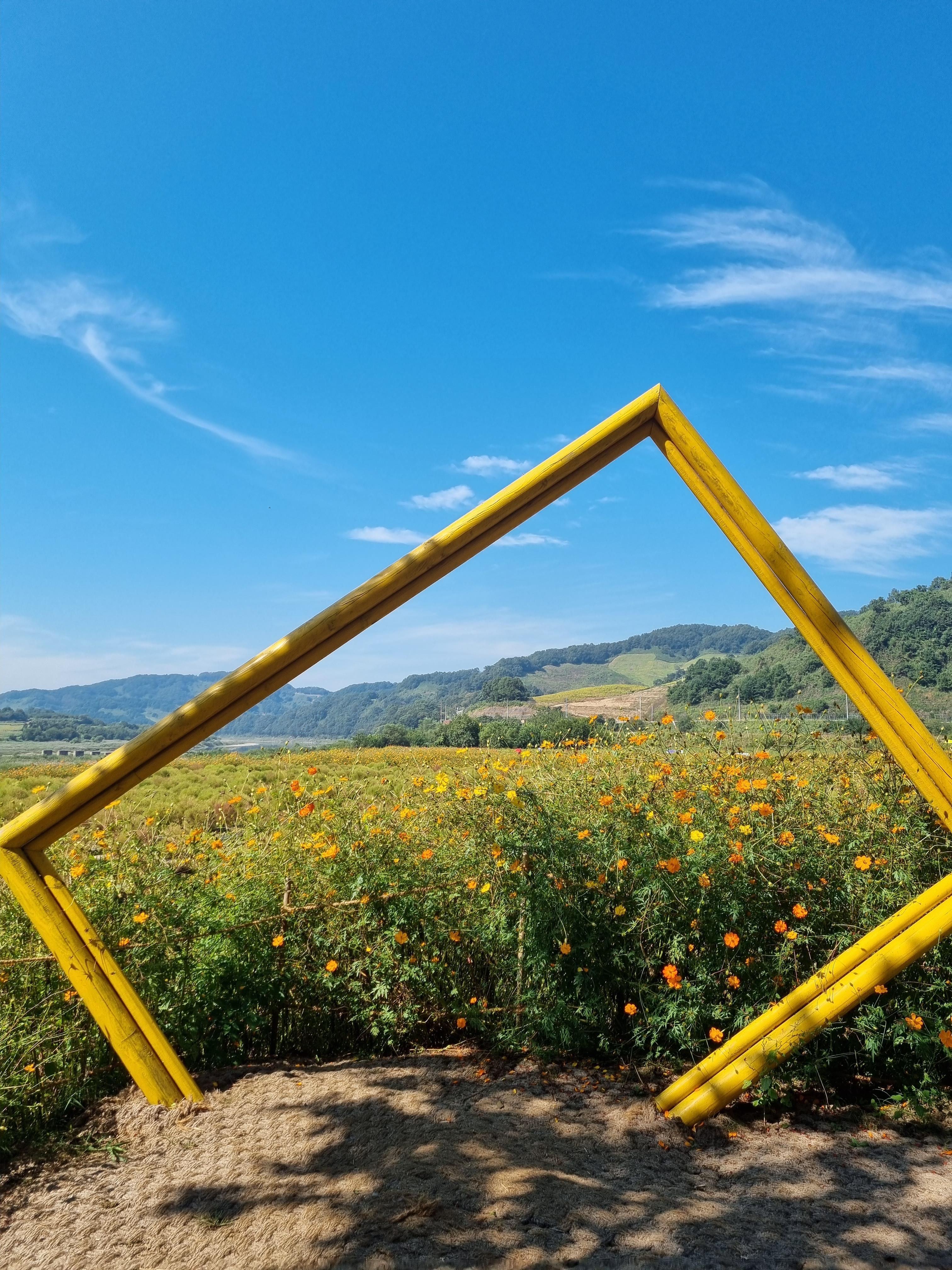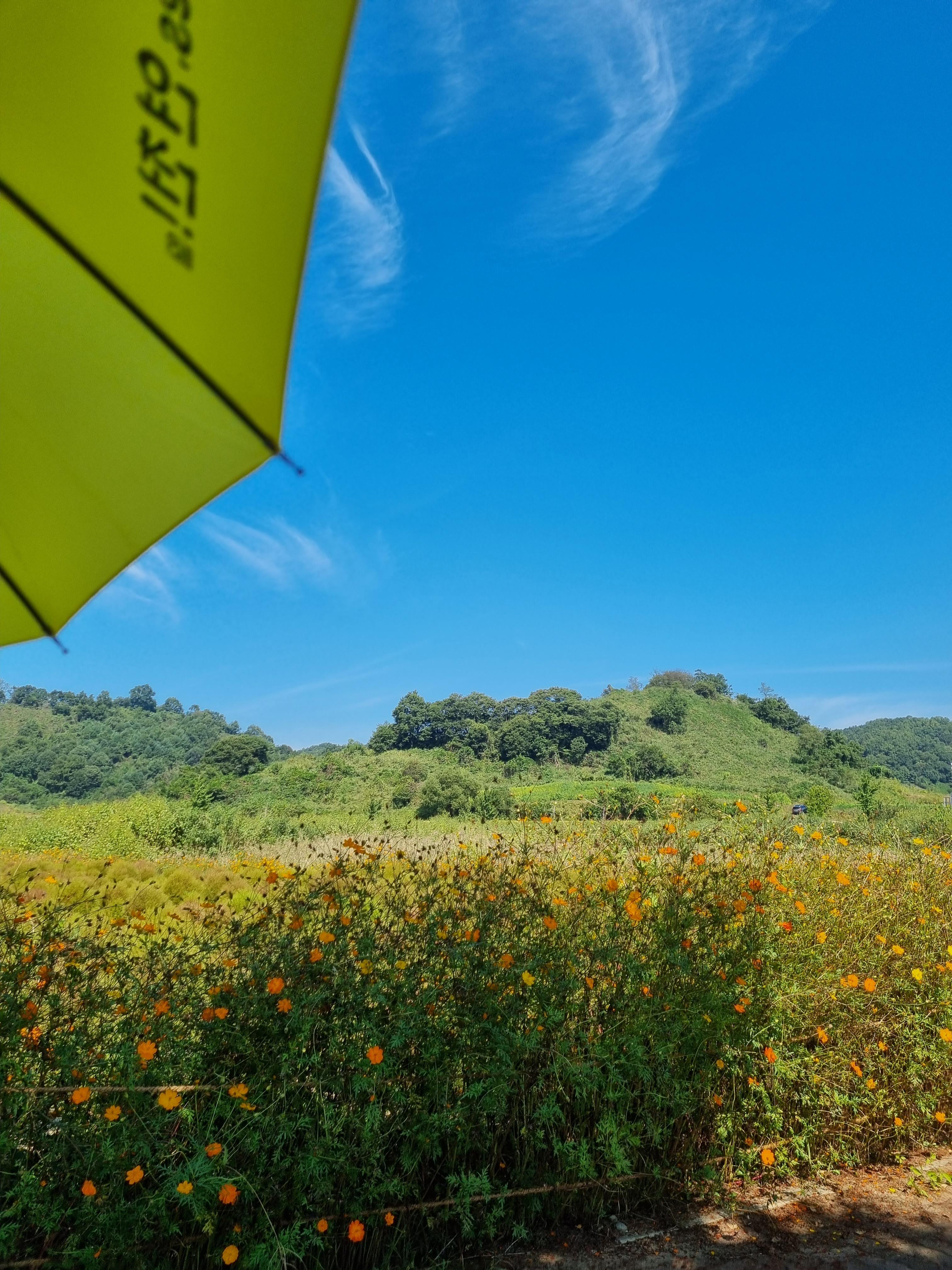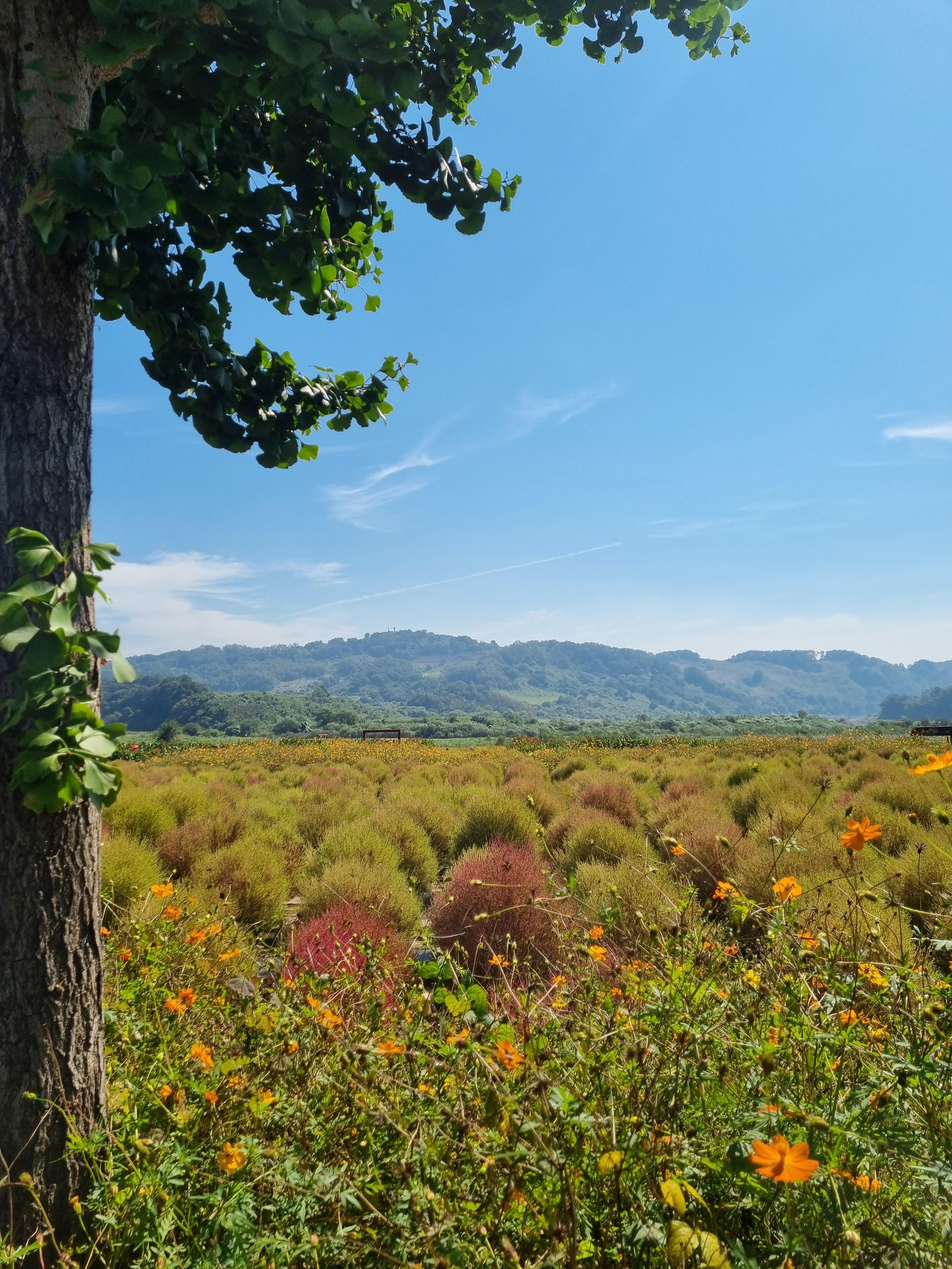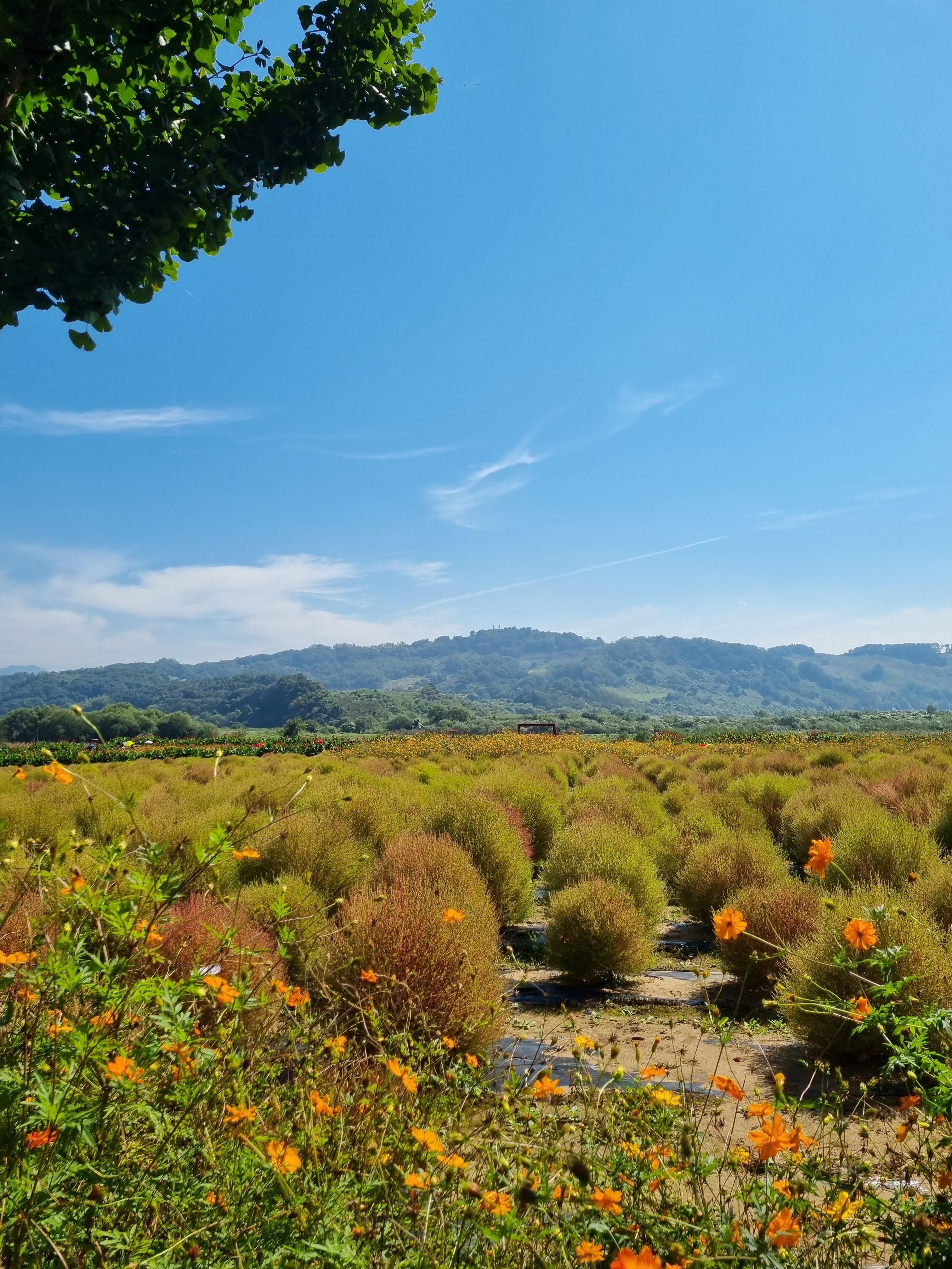 가을의 꽃이라고 불리는 코스모스도 보입니다. 주황빛을 띠는 코스모스가 흐드러지게 피어있는 댑싸리 공원은 막힘없이 보이는 산 과 함께 멋진 뷰를 자랑하고 있었습니다.
