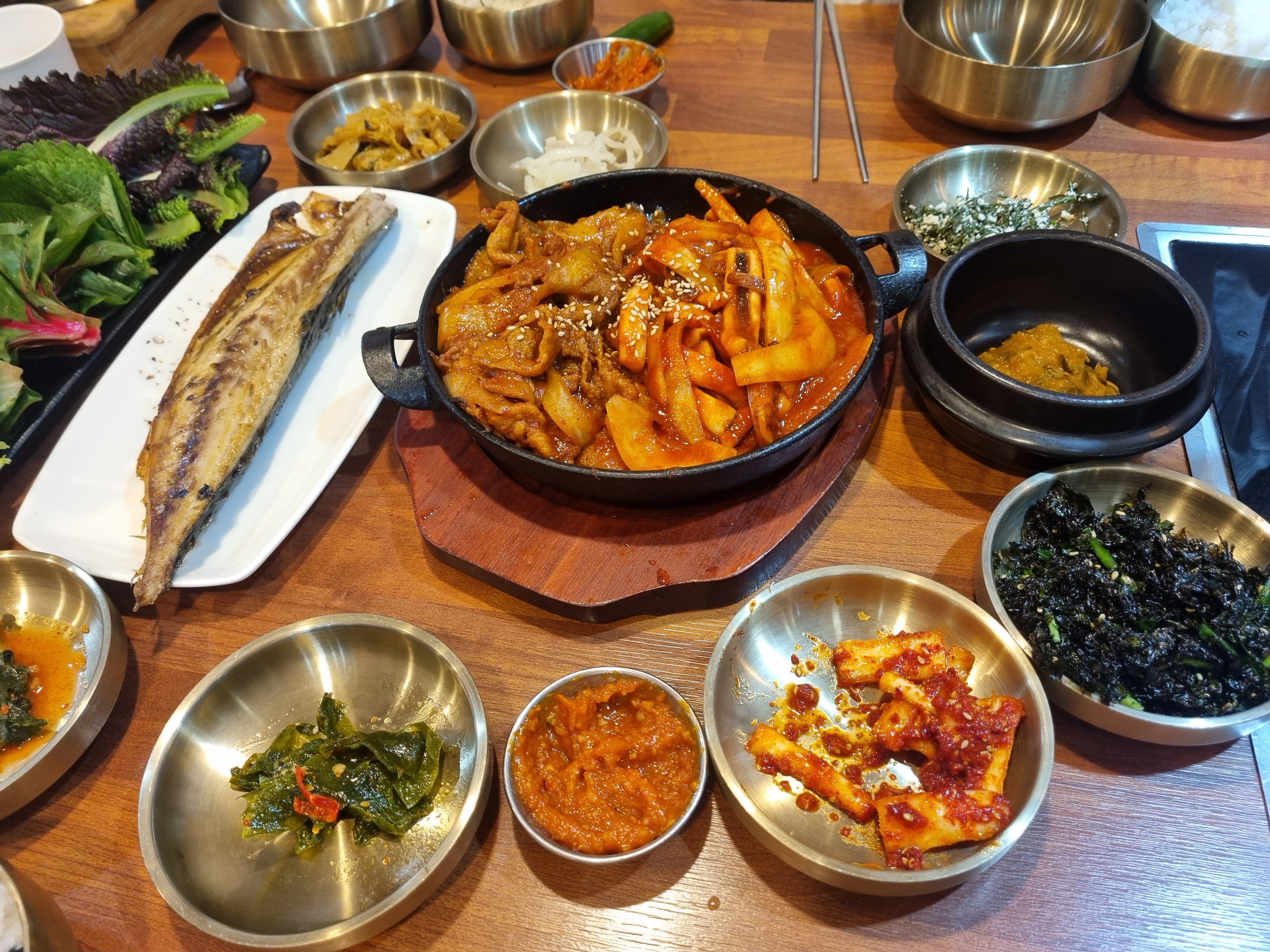 파주 맛집. 깔끔하다. 오징어볶음과 제육볶음에 추가로 생선구이까지 따끈한 돌솝밥은 장식의 마무리. 아는 사람만 아는 파주 맛집 들꽃쌈밥 집에서 맛있게 점심 먹고 왔어요.