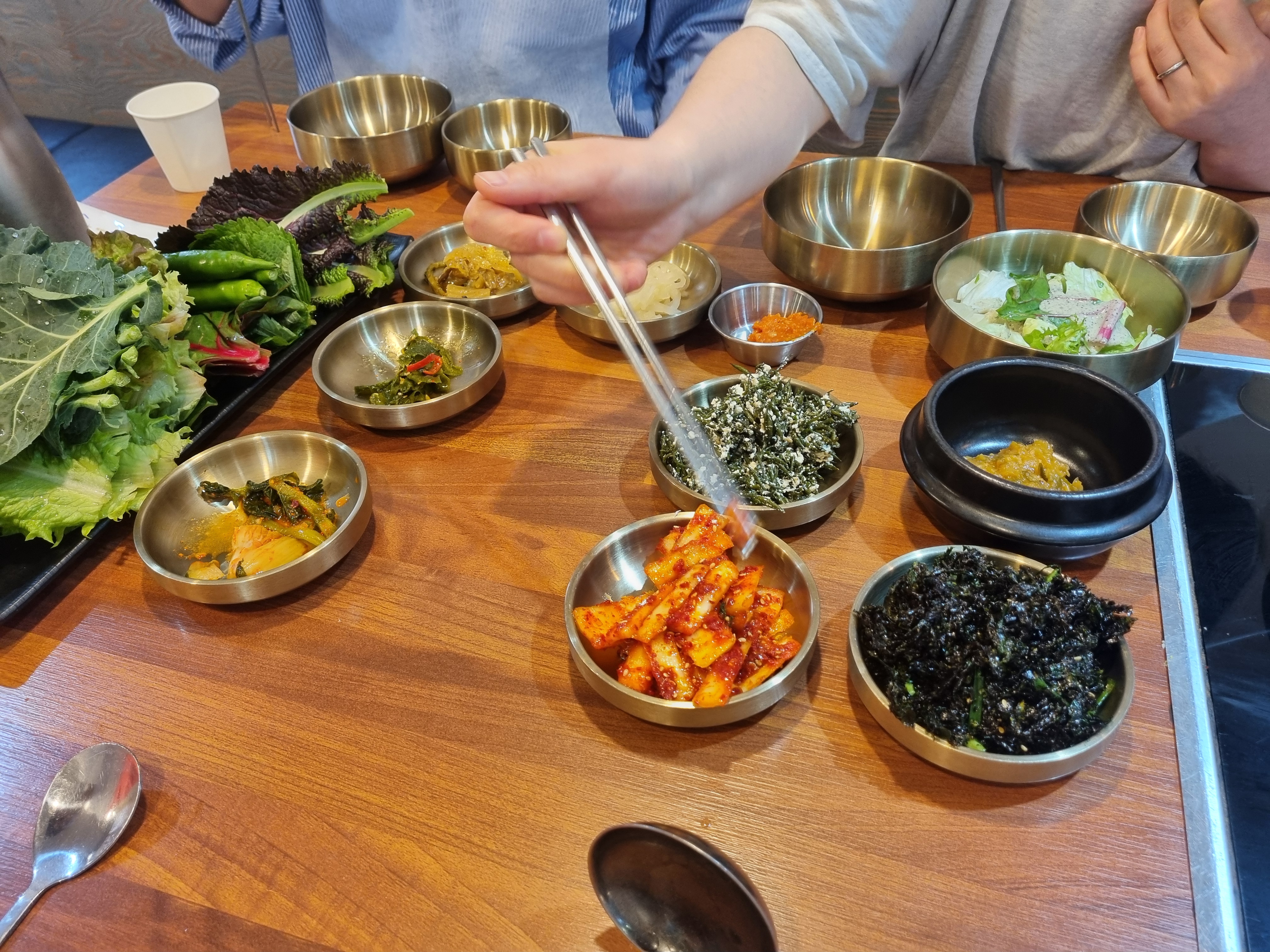 위에 사진 속 모습이 파주 맛집 들꽃쌈밥 식당 기본세팅의 모습이에요. 너무 깔끔하지 않나요? 제 동생이 못 참고 젓가락질한 도라지무침은 정말 정말 맛있어서 3번은 더 리필해서 먹었던 거 같아요.