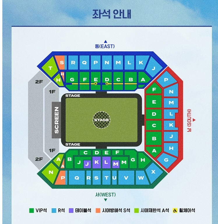 또한, 북쪽 좌석인 S석과 A석은 스크린이나 무대 위의 아티스트를 보기 어려울 수 있어요. 안전을 위해 가장 앞열도 고려해 보면 좋을 듯합니다.
